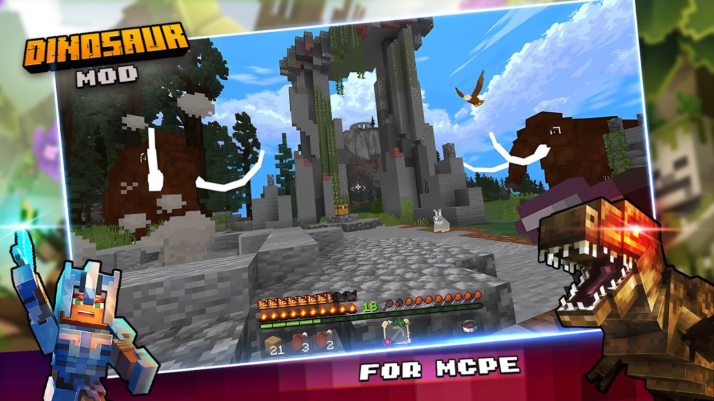 मिनीक्राफ्ट पे के लिए डायनासोर मॉड। जुरासिक क्राफ्ट वर्ल्ड गेम में टी रेक्स से लड़ें।
