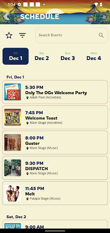 इस कार्यक्रम का अनुभव विभिन्न प्रकार के कलाकारों की बातचीत के साथ मंच से परे तक फैला हुआ है जो संगीत प्रेमियों और शौकीन छुट्टियों के लिए समान रूप से अंतिम अनुभव बनाता है। अंतरंग कार्यक्रम समुदाय को उपकरण कार्यशालाओं, पूल साइड गेम, समुद्र तट कॉर्नहोल टूर्नामेंट और स्थानीय क्षेत्र में दान के अवसरों में भाग लेने के लिए एक साथ लाता है।