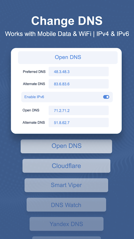 DNS Changer is the easiest way to change your DNS and test the speed of DNS servers. Works without root and works for both WiFi and Mobile Network Data Connection. The DNS Changer change’s your device’s DNS address, not affecting your connection speed in any way. So, it is faster than a regular VPN. Install DNS Changer for Android and try it yourself!