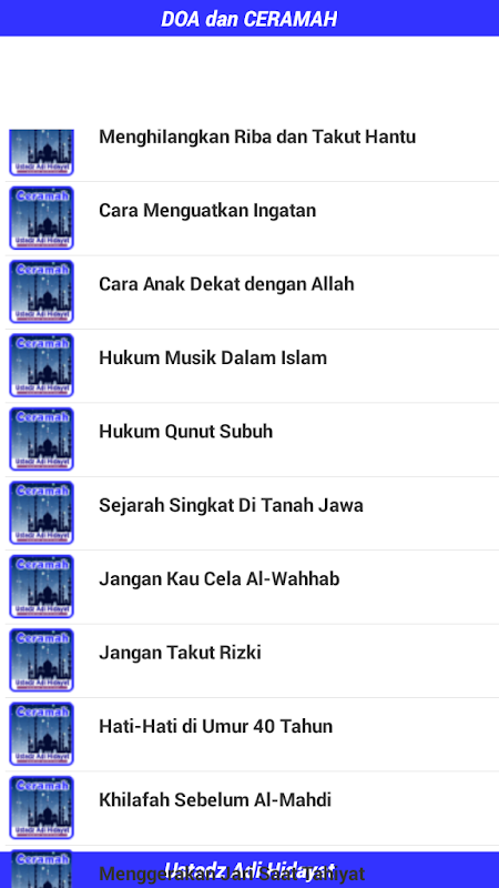 Aplikasi audio ceramah agama islam dari ustad adi hidayat yang dapat didengar secara offline adalah kumpulan dari ceramah-ceramah dari ustad adi hidayat.
