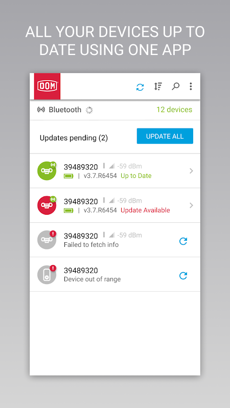DOM अपडेट एक ऑफ़लाइन और ऑनलाइन एप्लिकेशन है जिसका उपयोग डिवाइस डेटा को पढ़ने के लिए किया जा सकता है, जैसे कि फर्मवेयर संस्करण और बैटरी स्थिति, सभी इलेक्ट्रॉनिक DOM ENiQ लॉकिंग डिवाइस संस्करण v3.7 से आगे। इसके अलावा, इन इलेक्ट्रॉनिक लॉकिंग उपकरणों के फर्मवेयर अपडेट ब्लूटूथ लो एनर्जी के माध्यम से किए जा सकते हैं, उदा। सुरक्षा पैच आदि स्थापित करने के लिए