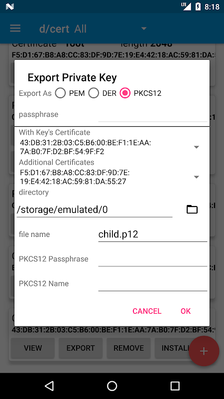 * आयात / निर्यात PEM, DER, PKCS12 प्रारूप (.pem .crt .pub .pub .key .der .pfx .p12)