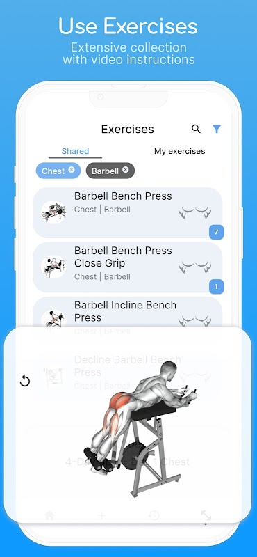 हमारे ऐप में प्रत्येक व्यायाम को सही ढंग से करने में आपकी मदद करने के लिए निर्देश और एनिमेटेड वीडियो के साथ शक्ति या कार्डियो के लिए व्यायाम का एक बड़ा संग्रह है। अपने खुद के वर्कआउट रूटीन को कस्टमाइज़ करें, वार्मअप, काम, असफलता या ड्रॉप सेट को बिल्ट-इन रेस्ट टाइमर के साथ जोड़ें और आसानी से अपनी पूर्णता को ट्रैक करें।