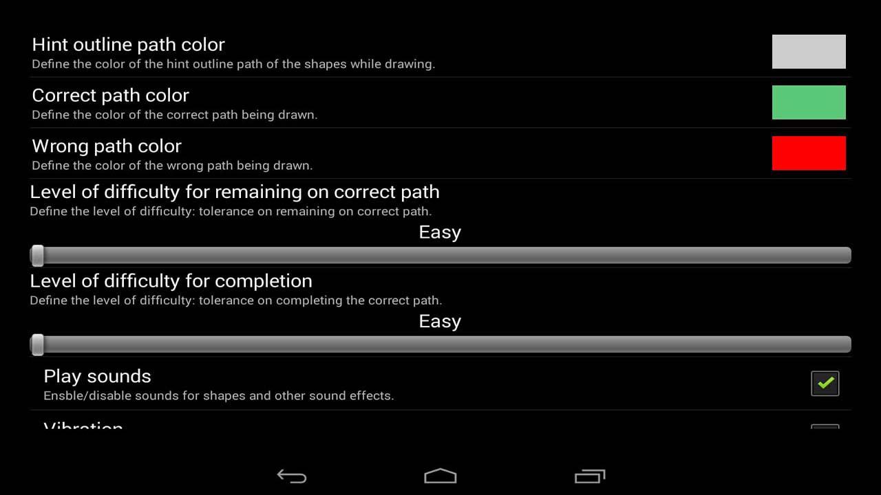 Draw Letters: The child must draw on the pre-drawn outline of the letter. As a reward, the child can draw then multiple letters of different colors and sizes with his/her finger. Parents can customize the level of difficulty and colors.