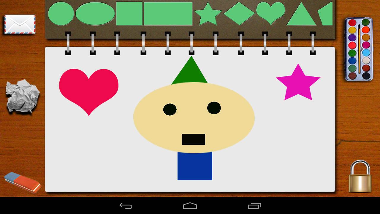 Shapes Collage: The child can combine shapes to create pictures. S/he can change the color, position, dimensions and angle of the shapes. The last 2 can be done using the two fingers gestures. The shapes can be deleted and locked/unlocked. The pictures can then be shared (e-mail, Facebook etc.).