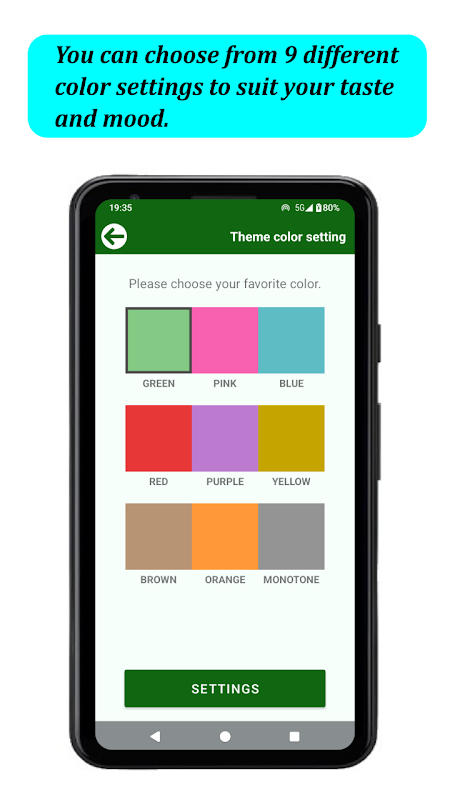 *थीम का रंग निम्नलिखित 9 रंगों में से चुना जा सकता है: हरा, गुलाबी, नीला, लाल, बैंगनी, पीला, भूरा, नारंगी और मोनोटोन।