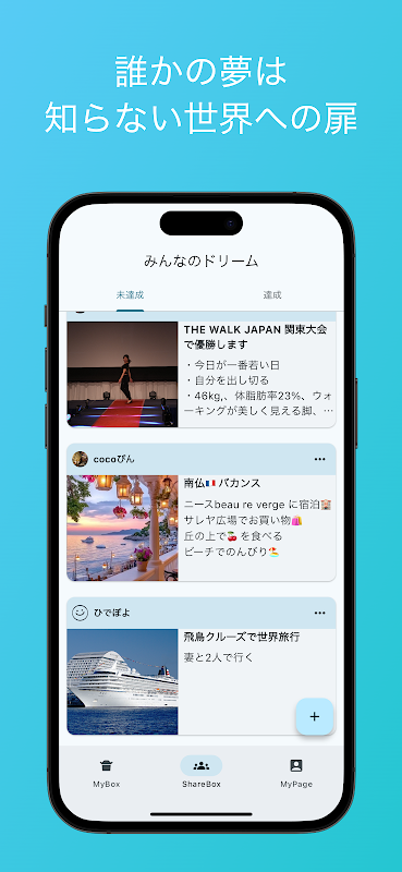 अन्य उपयोगकर्ताओं के सपनों से प्रेरित हों, और नई संभावनाओं को खोलने के लिए अपने सपनों को साझा करें। सपने कुछ ऐसे नहीं हैं जिन्हें आप अकेले पूरा करते हैं।