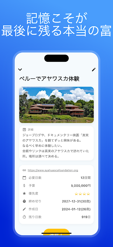 सहज और सरल यूआई आपको अपने सपनों को तुरंत रिकॉर्ड करने की अनुमति देता है। आप एक नज़र में देख सकते हैं कि उन्हें प्राप्त करने में कितने दिन बचे हैं, और अपने सपने के करीब पहुँचने की भावना का अनुभव कर सकते हैं।