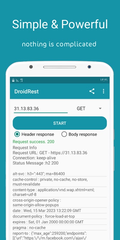 DroidRest Android के लिए एक साधारण रेस्ट एपीआई क्लाइंट है। यह मुफ़्त और उपयोग में आसान है।