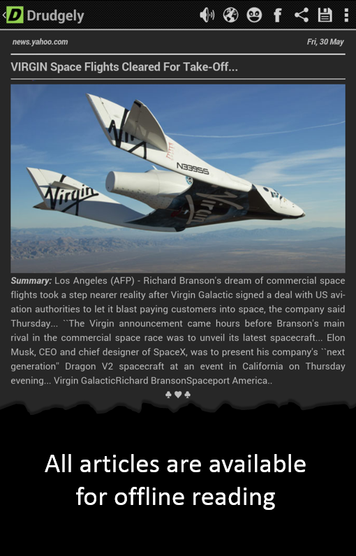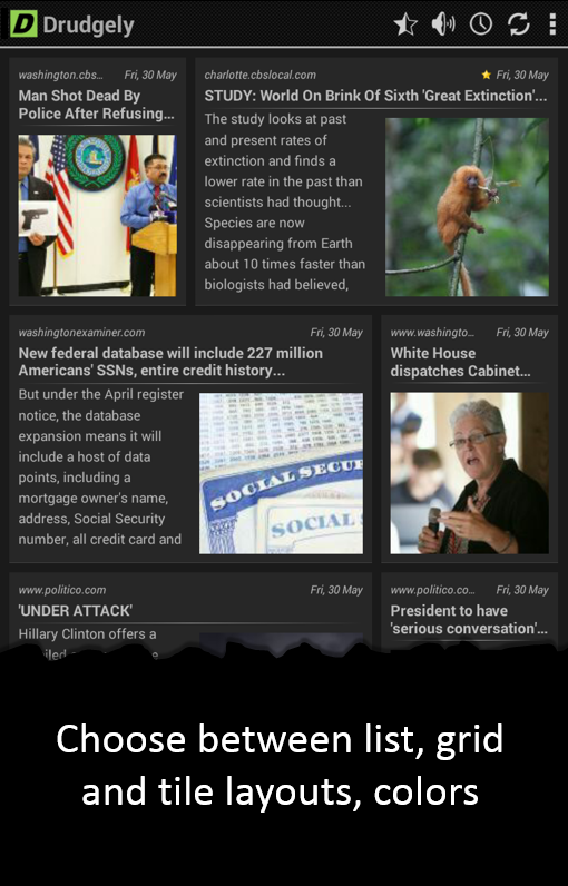 Drudge Report on steroids! Drudgely for Drudge Report is simply the most powerful and feature packed app for Drudge Report (www.drudgereport.com) on Android phones and tablets. Drudgely has many advanced features such as summarization, reader mode, text to speech, offline reading and translation that take the Drudge Report experience to the next level. Drudgely is optimized for both phones and tablets (especially 7" and 10" tablets like Nexus 7 and Nexus 10), with a list layout for phones and optional grid and tile layouts for tablets, similar to Flipboard or Google Currents.