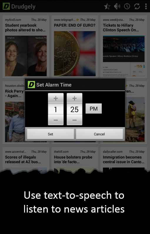* Use Text to Speech Alarm to wake up to the latest Drudge Report.