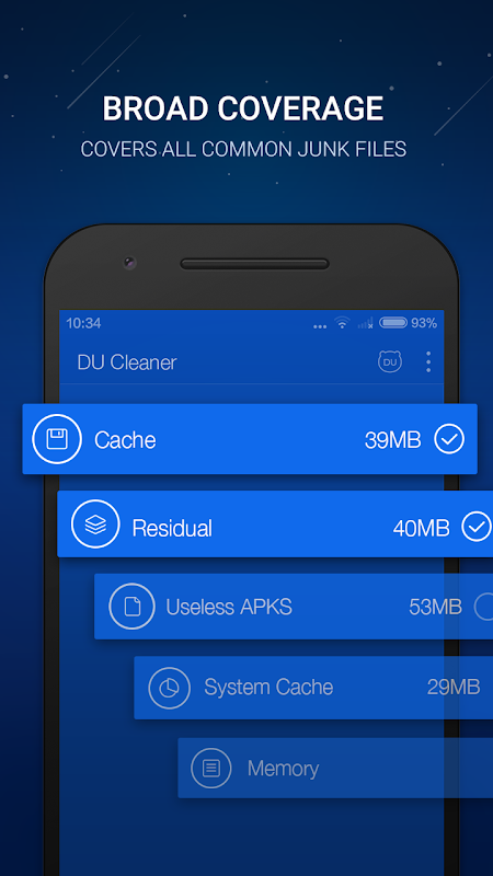 The junk-creating behavior of millions of apps has been analyzed so that DU Cleaner (Boost & Clear Cache) can efficiently hone in on its targets (cache and residual files) with perfect accuracy. Delete cache and residual files to reclaim storage, boost speed, and improve the performance of your device and SD card.
