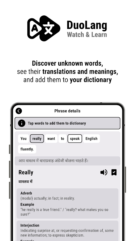 DuoLang: Watch & Learn आपका आदर्श ड्यूल सबटाइटल प्लेयर है, जिसे भाषा सीखने को मजेदार और प्रभावी बनाने के लिए डिज़ाइन किया गया है। अपनी पसंदीदा श्रेणियों में दिलचस्प वीडियो देखकर अपनी सुनने, बोलने और शब्दावली कौशल को सुधारें।