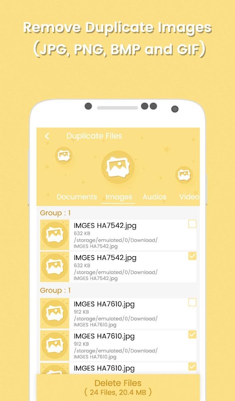 सभी डुप्लीकेट फ़ाइलें जैसे गाने, वीडियो, फोटो, दस्तावेज़ या कोई भी फ़ाइल सभी को एक साथ समूहीकृत किया जाता है ताकि उपयोगकर्ता त्वरित निर्णय ले सकें और सभी को एक बार में हटाया या हटाया जा सकता है।