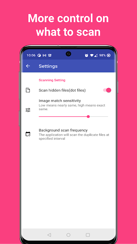 आपको डुप्लिकेट खोज के लिए आरंभ करने और स्कैन करने की आवश्यकता नहीं है। ऐप आपके फोन को ऐप सेटिंग में आपके द्वारा अनुमत निश्चित आवृत्ति पर स्कैन करता है और यदि कोई डुप्लिकेट पाया जाता है तो अधिसूचना दिखाता है।