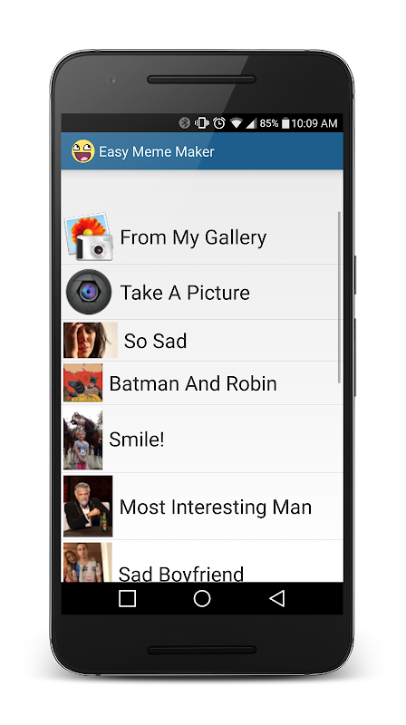 Easy Meme Maker is a Great FREE Meme Generator app. You can take photos and make memes, use existing images from your device and make memes or use the blank memes already inside the app!