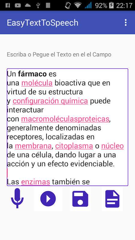Escribe o pega cualquier texto ya sea desde otra aplicación o desde un archivo “.txt” de la memoria de tu smartphone y conviértelo fácilmente el texto a voz.