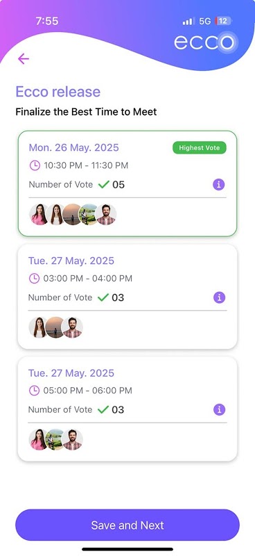🗳️ दोस्त या सहकर्मी अपने पसंदीदा समय स्लॉट और स्थानों के लिए वोट कर सकते हैं।