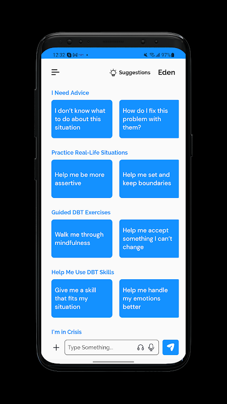 ईडन अपनी तरह का पहला एआई-संचालित डीबीटी (डायलेक्टिकल बिहेवियर थेरेपी) ऐप है जो आपको रिश्तों को संभालने, भावनाओं को प्रबंधित करने और वास्तविक समय में बेहतर निर्णय लेने में मदद करने के लिए डिज़ाइन किया गया है।