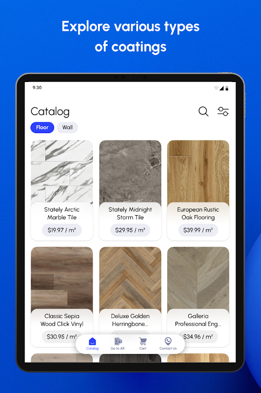 यह एआरकोर आधारित ऐप केवल आपके स्मार्टफोन/टैब और ऑगमेंटेड रियलिटी का उपयोग करके सबसे अच्छा फर्श और दीवार कवरिंग विकल्प चुनने की अनुमति देता है। कोई अतिरिक्त उपकरण नहीं, सॉफ्ट वगैरह।