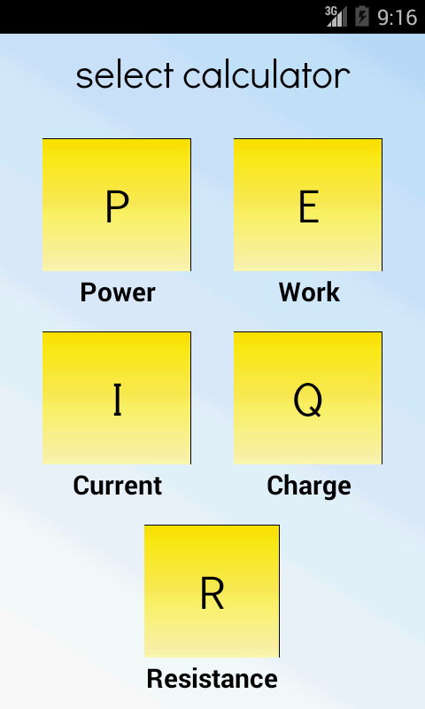 यह मुफ्त app सबसे महत्वपूर्ण बिजली के आकार की गणना करने में सक्षम है जो एक बिजली कैलकुलेटर, है. आप बिजली, विद्युत प्रतिरोध, बिजली के प्रभारी, बिजली के काम और मौजूदा बिजली की गणना कर सकते हैं.
