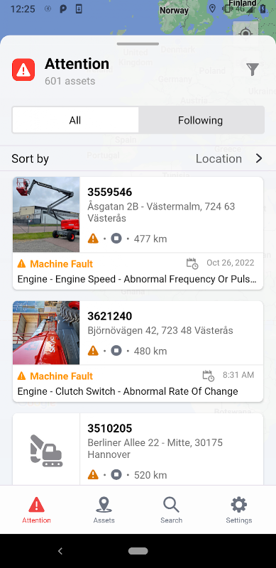 ELEVATE Go आपको न केवल बेड़े में सभी संपत्तियों का पूर्ण अवलोकन प्रदान करता है, बल्कि अनुसूचित सेवाओं, मशीन की खराबी, मुद्दों या अलार्म जैसी मशीन घटनाओं को भी प्रदान करता है।