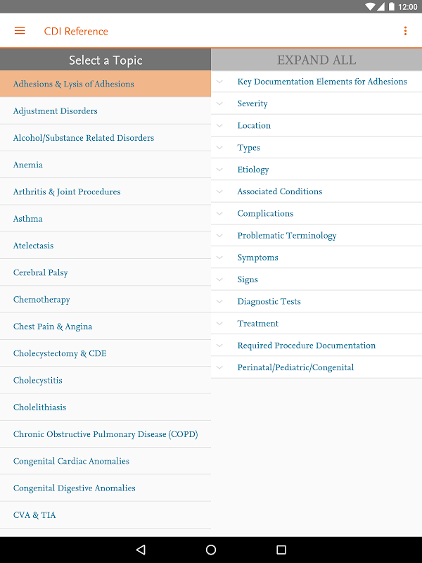 The Elsevier CDI Reference Mobile Application is a clinical documentation improvement (CDI) quick reference tool designed to pinpoint for, clinicians and CDI staff, clinical terms or phrases that may be used to accurately and completely describe, in detail, a specific condition. Specific documentation may be used to demonstrate medical necessity for services, justify admission and treatment, and accurately reflect a patients severity of illness. Emphasis is placed on necessary documentation for the ICD-10-CM/PCS coding system. Physician documentation should NEVER include information that is enhanced, modified, or otherwise inaccurate for the purposes of determining or increasing payment, or for any other situation in which a physician or facility may falsely gain.