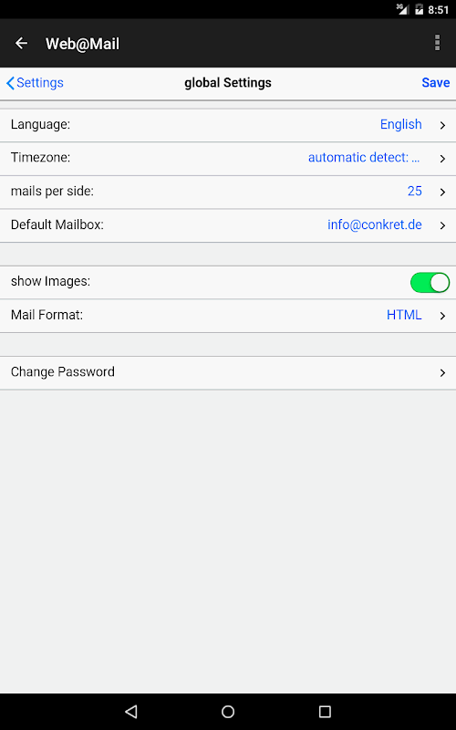 यह ऐप सभी के लिए एक अद्वितीय सार्वजनिक ईमेल-पते (डोमेन जैसे yourname.com जीमेल, हॉटमेल, याहू आदि जैसे मास-मेल के लिए नहीं) का उपयोग करने के लिए क्लाउड आधारित इंटरफ़ेस प्रदान करता है यह एक सार्वभौमिक क्लाउड आधारित मेल प्रदान करता है- जर्मनी में होस्ट की गई सेवा. राउंडक्यूब या गिरोह की जरूरत नहीं है।