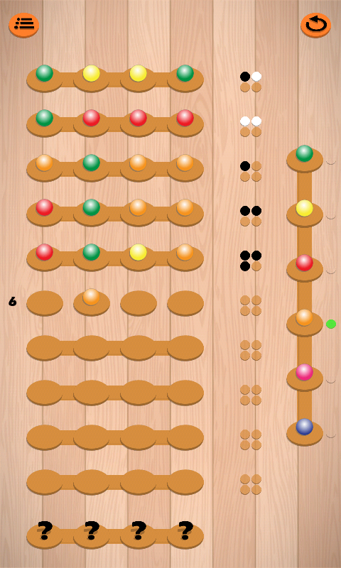 प्रत्येक बारी में आप चार रंगीन गेंदों का संयोजन चुनते हैं और फ़ोन/टैबलेट सही स्थिति पर प्रत्येक गेंद के लिए एक काली खूंटी और गलत स्थिति में संयोजन में मौजूद प्रत्येक गेंद के लिए एक सफेद खूंटी लौटाता है।