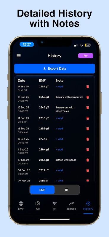 अपने फ़ोन को एक पेशेवर विद्युत चुम्बकीय क्षेत्र डिटेक्टर में बदलें। EMF के लिए अत्याधुनिक AR विज़ुअलाइज़ेशन और ब्लूटूथ एक्सपोज़र के लिए एक शक्तिशाली RF स्कैनर का अनुभव करें—एक ही साफ़-सुथरे, गोपनीयता-प्रधान ऐप में।