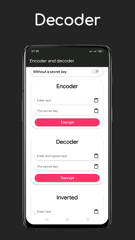 हमारा ऐप आपके संदेशों और डेटा की सुरक्षा सुनिश्चित करने के लिए कई एन्क्रिप्शन विधियां प्रदान करता है। हमारे उपयोगकर्ता-अनुकूल इंटरफेस के लिए धन्यवाद, आप विभिन्न एन्क्रिप्शन विधियों का उपयोग करके टेक्स्ट को आसानी से एन्क्रिप्ट और डिक्रिप्ट कर सकते हैं।