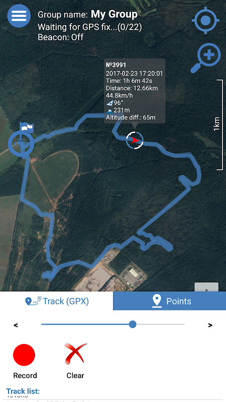 Tracks can be recorded and loaded from GPX files. Loaded GPX track also displays information about start time, total time, traveled distance, max and average speed, etc.
