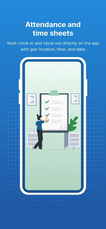 - उपस्थिति और समय पत्रक- जियो-लोकेशन, समय और तारीख के साथ सीधे ऐप पर क्लॉक-इन और क्लॉक-आउट चिह्नित करें।