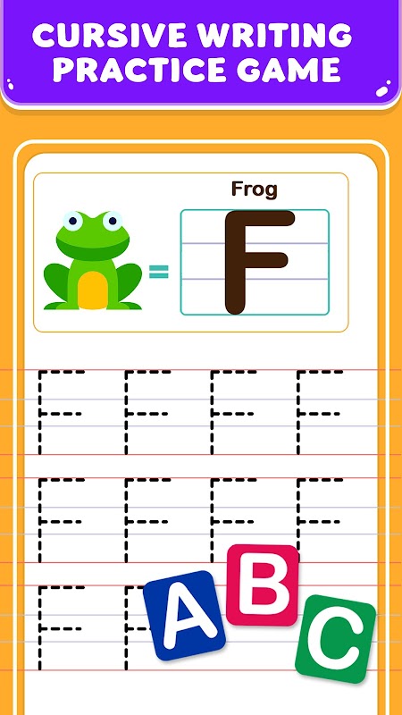 एबीसी गेम सीखने वाले ट्रेसिंग और फोनिक्स आपको कर्सिव राइटिंग की दुनिया से परिचित कराते हैं. आज ही कर्सिव ऐप डाउनलोड करें और अपनी सीखने की यात्रा को एक साहसिक कार्य में बदल दें!