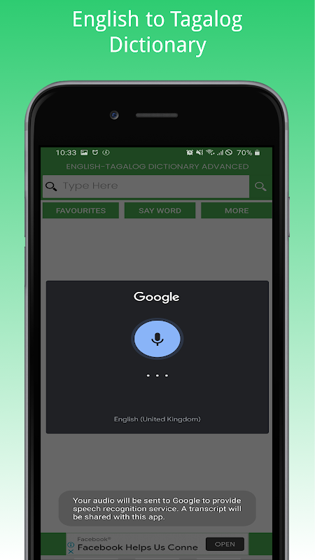 Our Free English to Tagalog Dictionary application is a light weight and powerful dictionary software. You can find over 500000+ English words with their 800000+ Tagalog meanings for Free on your Android smartphone or tablets! You can easily search for any word you want and find the meaning easily in a fastest way.