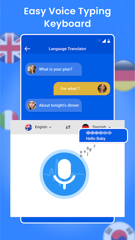 हमारा वॉयस टाइपिंग ट्रांसलेटर कीबोर्ड भाषण से टेक्स्ट कीबोर्ड में सहायता करता है, अब आपको बस बोलने और अपनी स्क्रीन पर टेक्स्ट प्राप्त करने की आवश्यकता है, इस वॉयस टाइपिंग फीचर ने आपके लिए दुनिया भर के लोगों के साथ संवाद करते समय आसानी पैदा की है. आप वॉयस ट्रांसलेटर कीबोर्ड से अपनी आवाज को तुरंत किसी भी वांछित भाषा में अनुवाद कर सकते हैं.