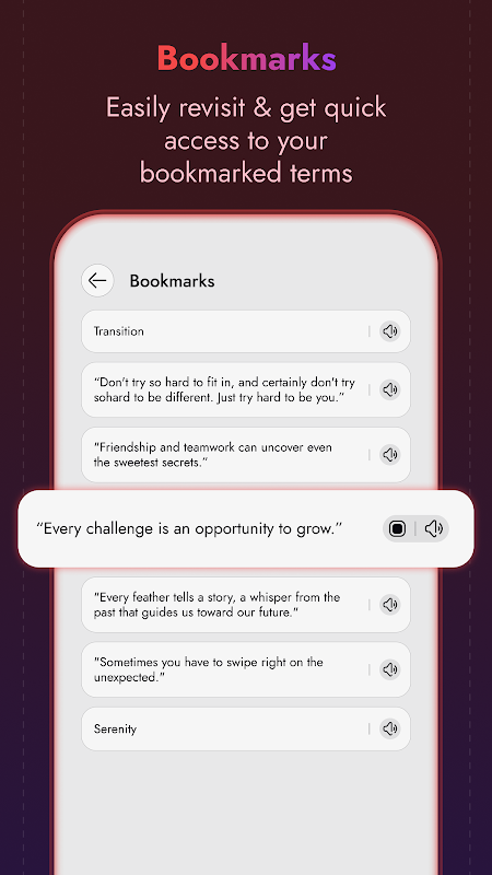• पढ़ते या सुनते समय उपयोगकर्ता द्वारा बुकमार्क किए गए सभी शब्द या वाक्य यहां पाए जा सकते हैं।