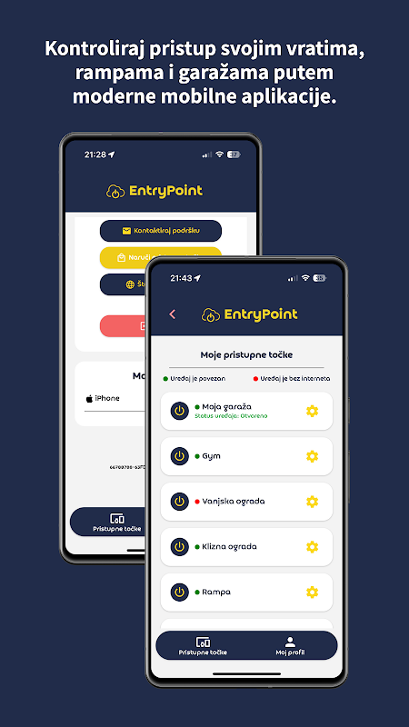 EntryPoint एक समाधान है जो आपको रिमोट कंट्रोल की आवश्यकता के बिना आसानी से और सुरक्षित रूप से पहुंच प्रबंधित करने की अनुमति देता है। चाहे आप गैरेज, रैंप या बाड़ खोल रहे हों, आप जहां भी हों, अपने मोबाइल फोन से सीधे सब कुछ नियंत्रित कर सकते हैं।