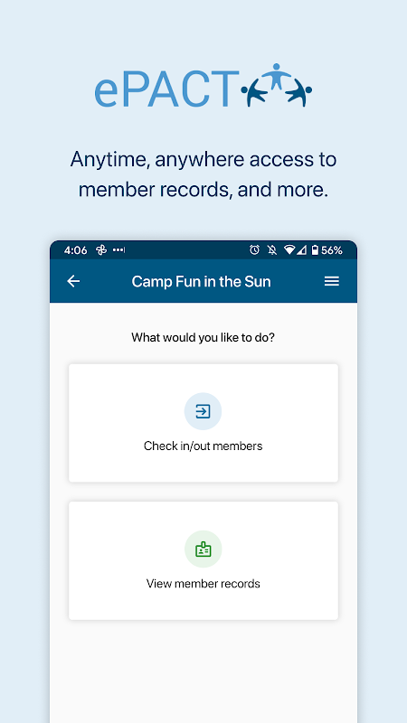 EPACT एडमिन ऐप अधिकृत उपयोगकर्ताओं को दिन-प्रतिदिन और आपातकालीन स्थिति में ऑफ़लाइन मोड सहित महत्वपूर्ण सदस्य जानकारी को सुरक्षित रूप से एक्सेस करने की अनुमति देता है। कर्मचारी जल्दी और आसानी से चिकित्सा और संपर्क विवरण देख सकते हैं, सदस्यों को अंदर और बाहर साइन कर सकते हैं, या अपने स्मार्टफोन या टैबलेट से सीधे संदेश भेज सकते हैं।