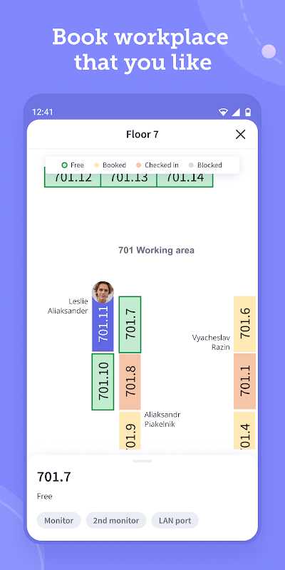 बस कुछ ही टैप से कार्यालय में अपना पसंदीदा कार्यस्थल बुक करें। अपना सामान रखने के लिए पार्किंग स्थल और लॉकर के बारे में न भूलें।
