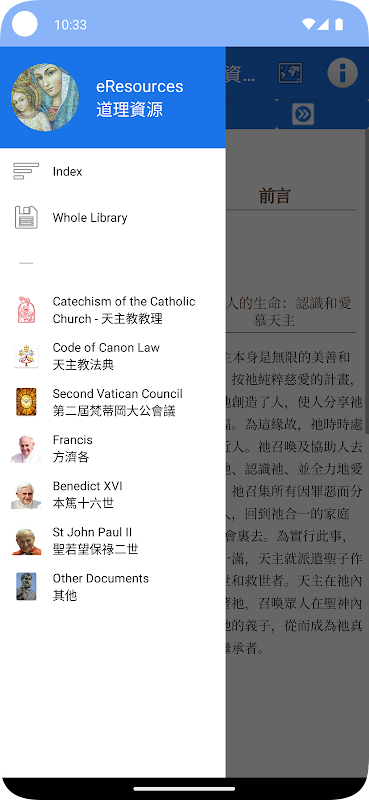 ऐप में कैथोलिक चर्च की धर्मशिक्षा शामिल है; कैनन कानून का कोड; द्वितीय वेटिकन परिषद के दस्तावेज़; और पोप फ्रांसिस, पोप बेनेडिक्ट XVI और सेंट जॉन पॉल II के मुख्य विश्वकोषीय पत्र और दस्तावेज़।