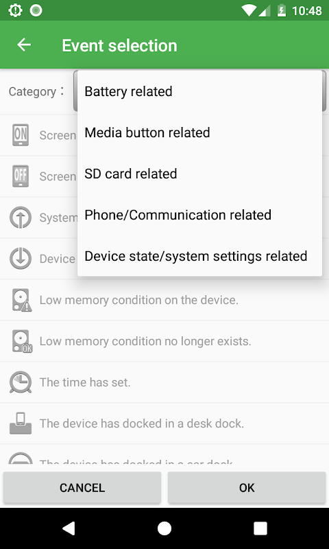 (1) घटनाक्रम घटनाएं एंड्रॉइड उपकरणों के मॉडल के आधार पर भिन्न होती हैं। कुछ घटनाएं कुछ उपकरणों पर नहीं हो सकती हैं। यदि आप 'सेटिंग्स' का 'इवेंट चेक मोड' चालू करते हैं तो आप देख सकते हैं कि आपकी स्क्रीन पर कौन सी घटना होती है।