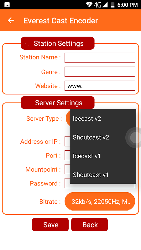 बस उपयोगकर्ता नाम और पासवर्ड या Icecast का उपयोग कर या SHOUTcast सर्वर का आईपी पता, पोर्ट और पासवर्ड आदि, प्रेस प्रारंभ बटन के साथ कनेक्शन का विवरण की स्थापना की और अपने मित्रों को अपने लाइव प्रसारण सुन सकते हैं करते हैं। आप जहां कहीं भी हो !