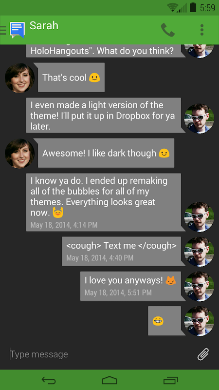 To select this theme, open up EvolveSMS, Settings>Theme Settings>(scroll down to Add-On Themes)>Use Add-on Theme>Envy_HoloHangouts