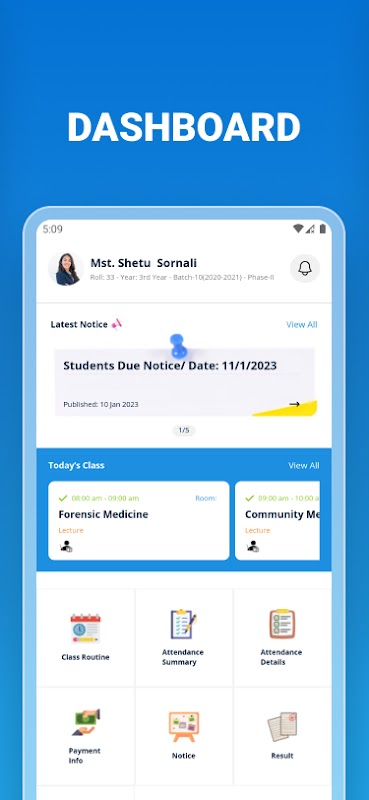 उपस्थिति : आप अपनी उपस्थिति अपने मोबाइल से देख सकते हैं। अनुपस्थितियों को चिह्नित करना और कक्षा की उपस्थिति रिपोर्ट तक पहुंचना पहले से कहीं अधिक आसान है।