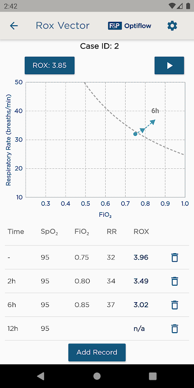 आवेदन ऑक्सीजन के अंश और श्वसन दर से परिधीय ऑक्सीजन संतृप्ति को विभाजित करके ROX सूचकांक की गणना करता है। सूचकांक में हाइपोक्सिक श्वसन विफलता वाले रोगियों में नाक के उच्च प्रवाह चिकित्सा की सफलता की भविष्यवाणी करने का प्रस्ताव किया गया है।