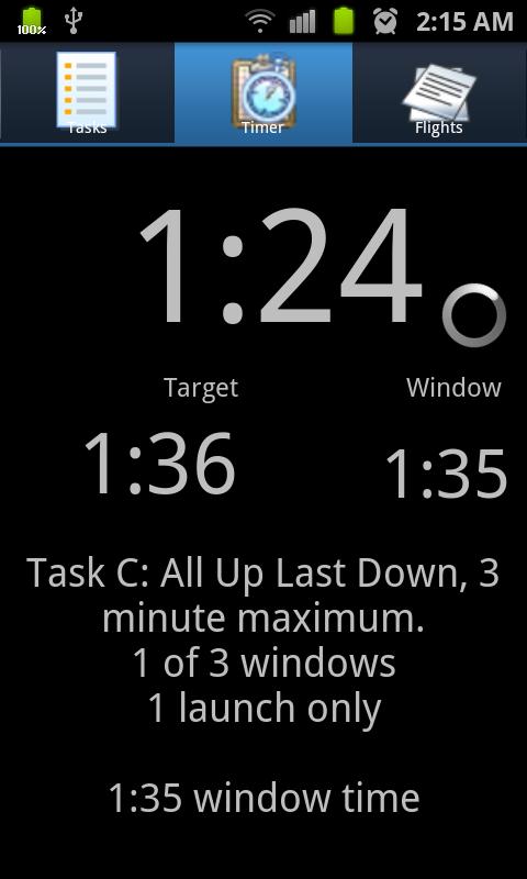 उपलब्ध सरकारी F3K कार्यों, विशेष अभ्यास कार्य से चयन करें या अपना स्वयं विन्यस्त करें. वे कार्य में परिवर्तन के रूप में अपनी उड़ान, खिड़की और लक्ष्य टाइम्स टाइमर को प्रदर्शित करता है और बताते हैं. आप कार्य के माध्यम से प्रगति के रूप में जहां आवश्यक लक्ष्य समय निकाला जाता है.