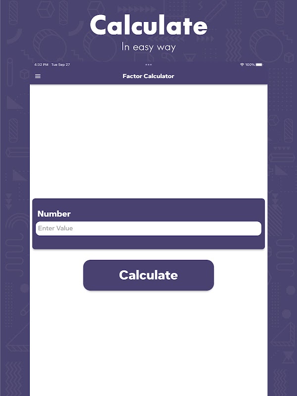 समाधान के साथ कारक कैलकुलेटर आपको दिए गए मूल्य के सभी कारकों की गणना और पता लगाने में सक्षम बनाता है। आपको केवल खाली बॉक्स में कोई भी नंबर डालने की जरूरत है। कैलकुलेट बटन पर टैप करें और यह कैलकुलेटर उस नंबर के सभी फैक्टर्स को दिखाएगा।