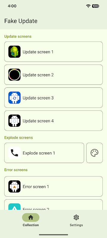 विभिन्न प्रकार की स्क्रीन में से चुनें: एंड्रॉइड और विंडोज अपडेट स्क्रीन, ब्लू स्क्रीन ऑफ़ डेथ एरर, फ़ैक्टरी रीसेट, कर्नल पैनिक, लिनक्स टर्मिनल और बिल्कुल नई एक्सप्लोड स्क्रीन - आपके पसंदीदा मीम्स से प्रेरित, अब पूरी तरह से कस्टमाइज़ करने योग्य।