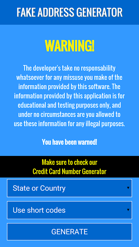 Fake address generator is a zip code tool and address generation app for generating fake but valid north american addresses.